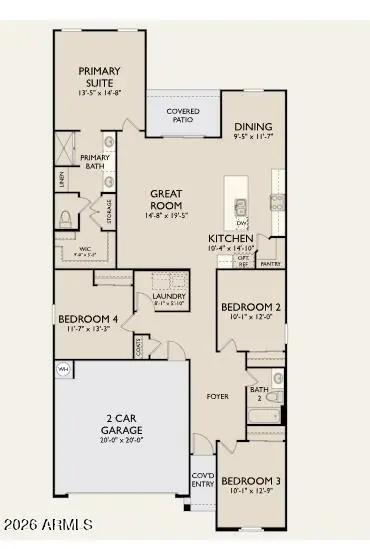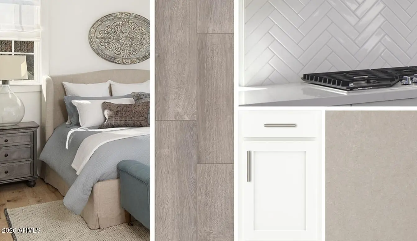 Welcome to the Iris floorplan at Alba in Amarillo Creek, Maricopa. This Spanish-style home offers 1,797 sq ft with 4 bedrooms, 2 bathrooms, and a 2-car garage on a premium lot. The open-concept kitchen, dining, and great room connect to a covered patio with sliding glass door. Two front bedrooms share a bath, while the spacious primary suite features dual sinks, walk-in shower with glass, water closet, linen and walk-in closets. Finishes include the Timeless Collection, wood-look tile flooring, quartz countertops, stainless steel GE gas appliances with fridge, washer/dryer, faux wood blinds, and garage door opener--move-in ready.
